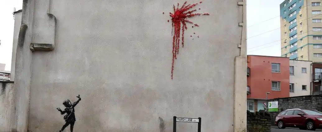 Fans and critics, as usual, are deep into deciphering the hidden meanings in this latest piece of social commentary. Aside from the obvious nod to Valentines day, the young girl fires a slingshot, traditionally symbolic of a naughty boy in childhood, now empowered to a little girl. The striking red flowers exploding: a symbol of broken hearts? war over love? Banksys famous red balloon girl bursting her lost balloon? Some have speculated it has a connection to the houses owner who has suffered his own personal tragedy and the mural was painted on his birthday.